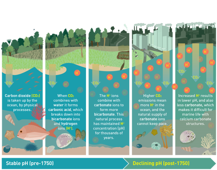 The chemistry of ocean acidification - how increasing CO2 leads to ocean acidification.