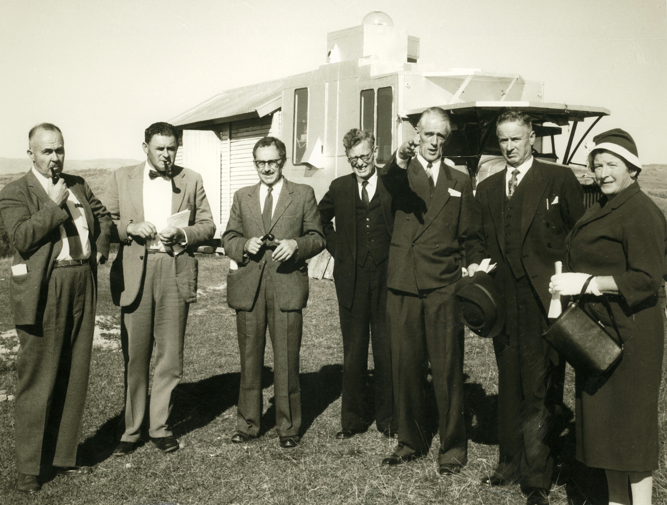 The official tour of the new Dominion Physical Laboratory Auroral Station on 7 April, 1961. Bob Unwin points out features to the local MP, Mr J. George and Mrs George.