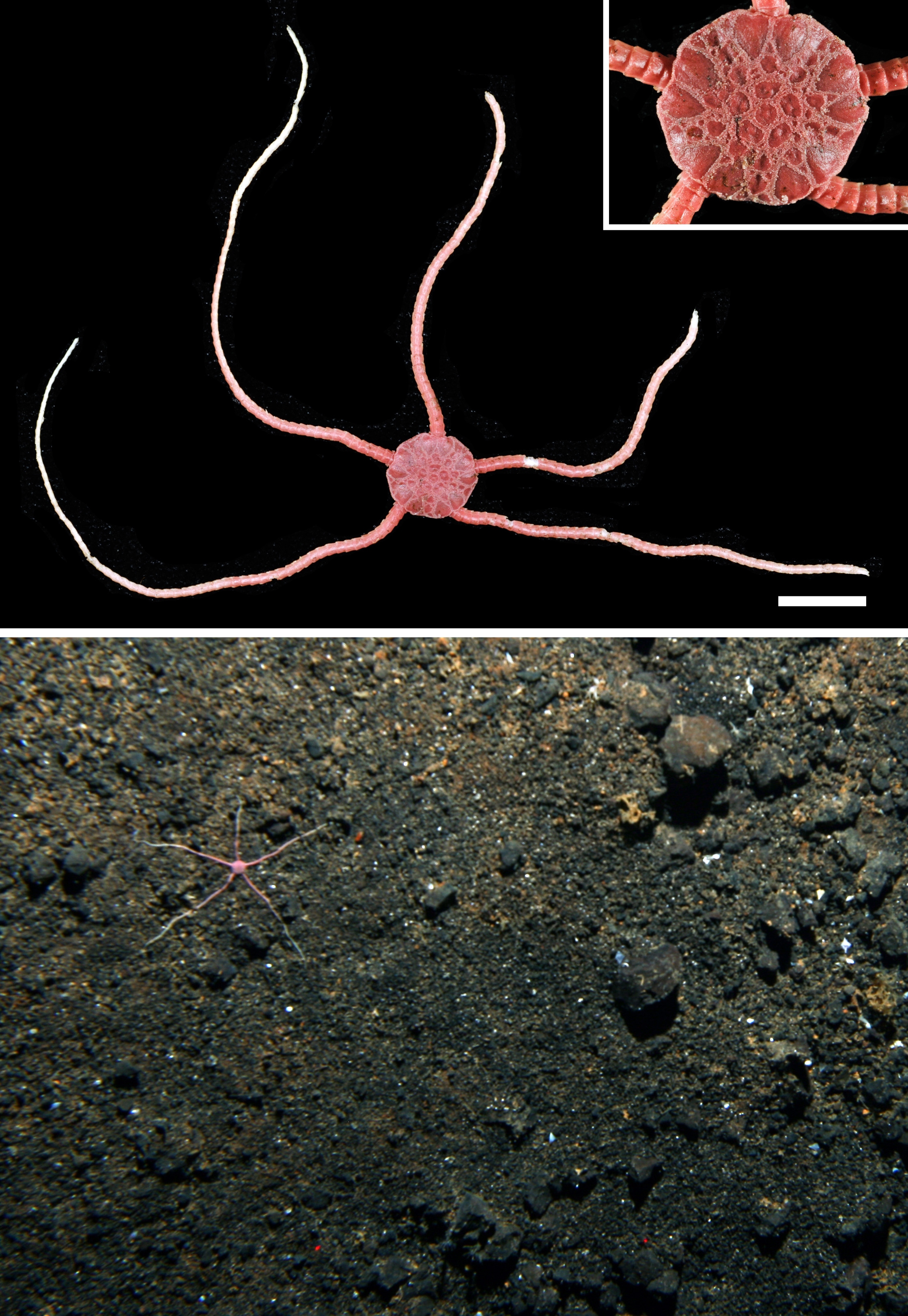 Specimen photo by Owen Anderson/ NIWA, seafloor image by DTIS/ NIWA. Scale bar in specimen photo is 0.5 cm, and the red laser dots in the seafloor image are 20 cm apart.