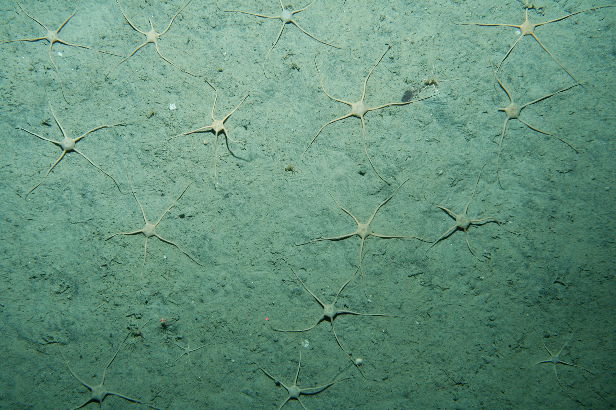 Ophiomusium lymani loves mud. They are found exclusively on muddy plains like this one from the Chatham Rise at 1150m. The red laser pointers are spaces 20 cm apart.