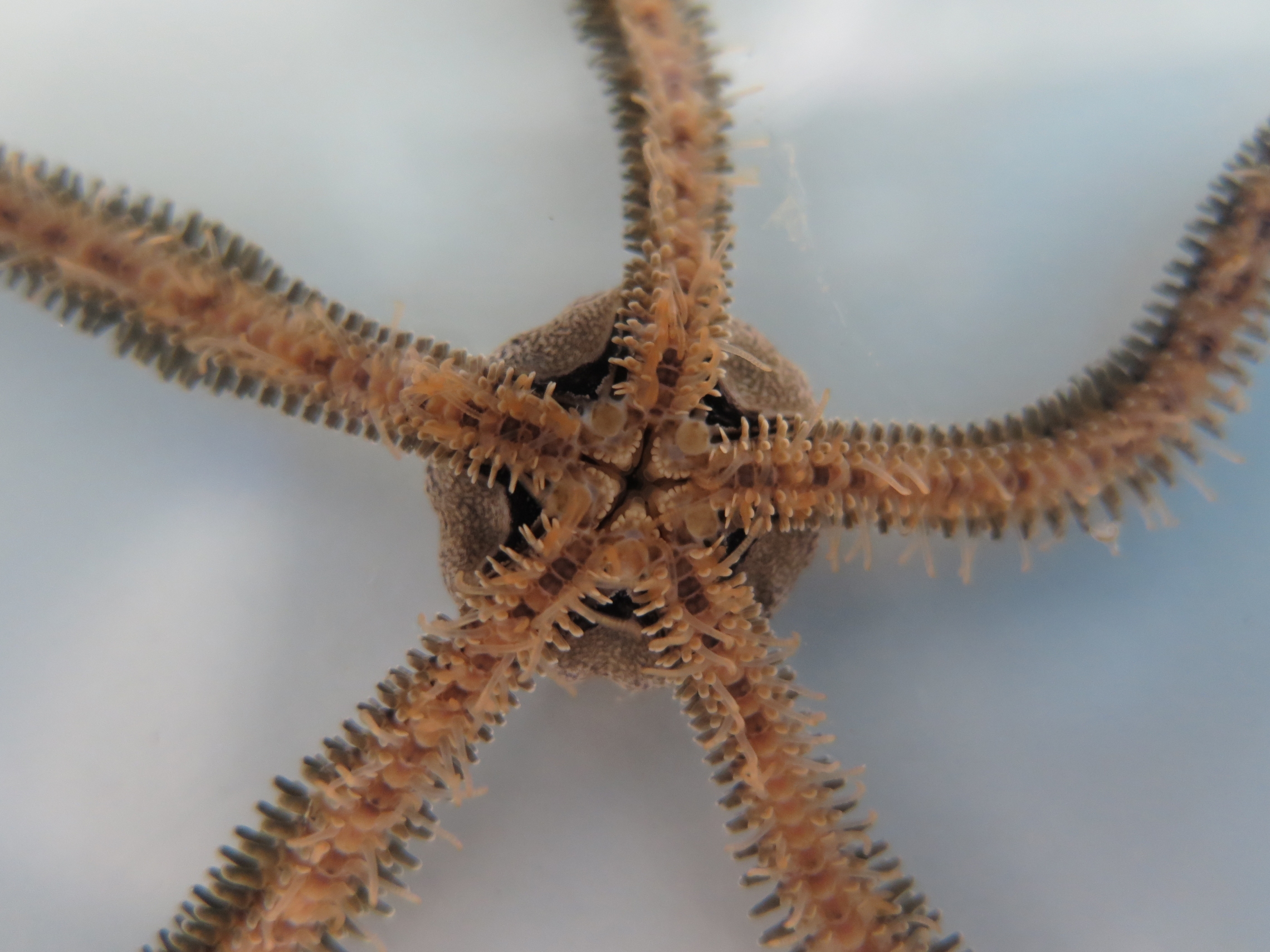 Ventral (underside) view of Ophionereis fasciata. The jaw is in the centre of its disc and lined with oral papillae.
