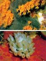 Orange anemones and three kinds of sponges from Spirits Bay, Northland.