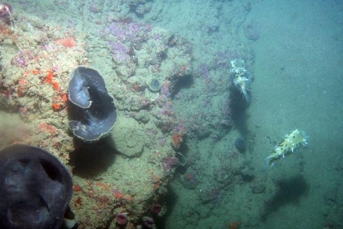 Mapping biodiversity: purple cup sponges, bright orange encrusting sponge, pink coralline algae, primnoid gorgonian and two puffer fish. (NIWA)