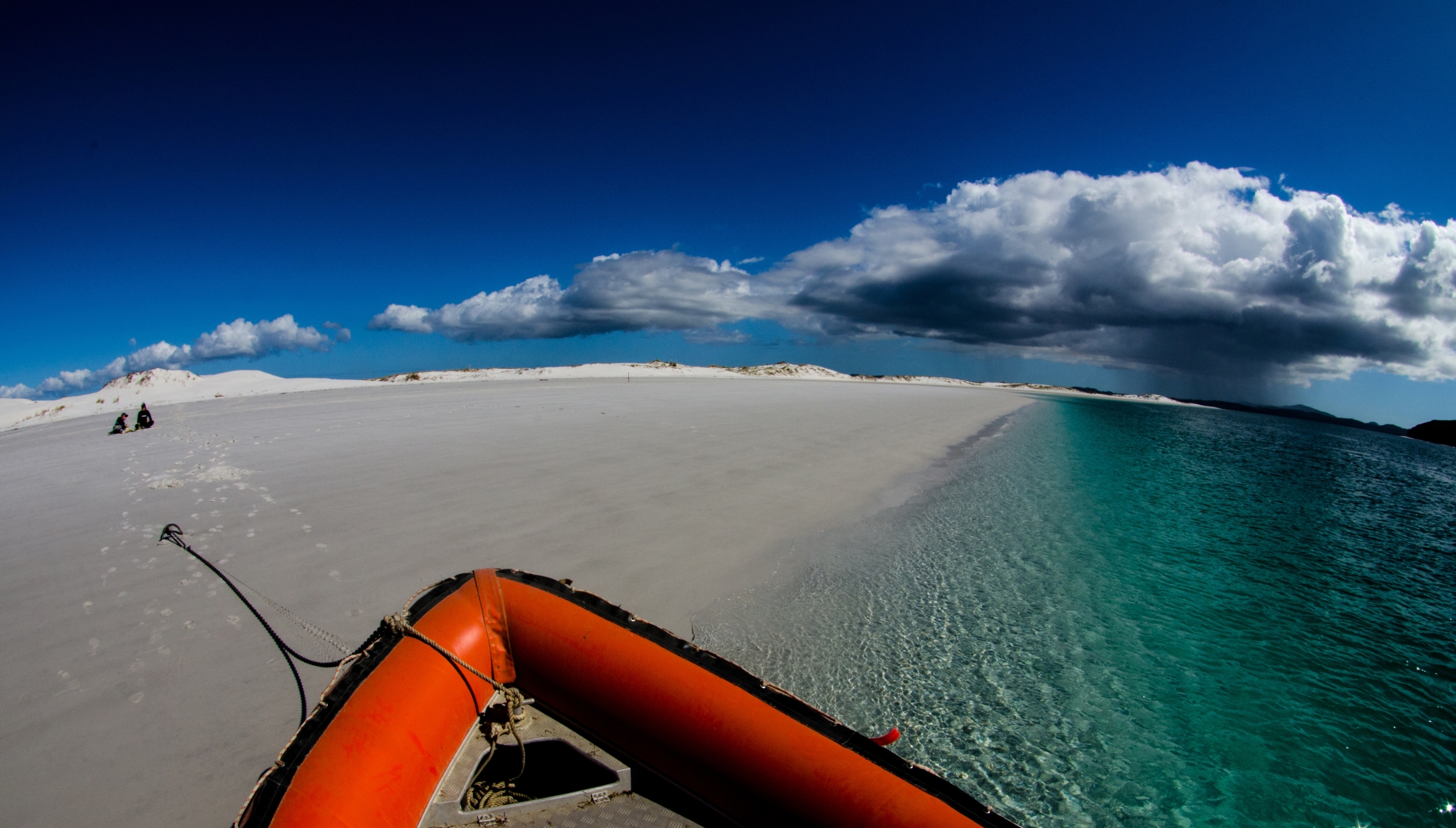 One of NIWA's small vessels anchors up for a lunch break in the stunning Parengarenga Harbour in the Far North of New Zealand as a squally shower soaks the small settlement of Te Hapua. Scientist Meredith Lowe and Masters student Tegan Evans enjoy the break during surveys of juvenile fish assemblages associated with seagrass meadows.