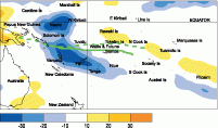 Outgoing Long-wave Radiation (OLR) anomalies, in Wm-2 (blue equals high rainfall and yellow equals low rainfall). The October 2006 position of the SPCZ, as identified from total rainfall, is indicated by the solid green line. The average position of the S
