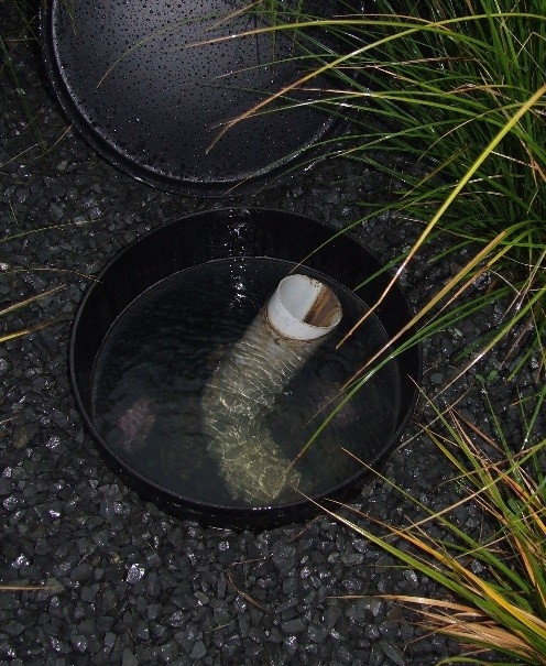 Discharge from the outlet of the greywater treatment wetland before it goes through the harakeke infiltration trench.