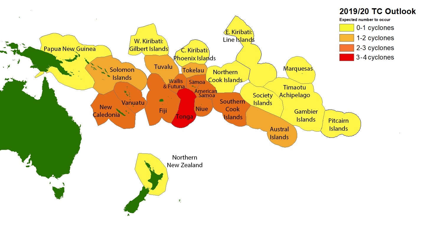 Map of overall seasonal outlook for the number of named storms interacting with an island group based on the 2019-20 Island Climate Update tropical cyclone guidance.