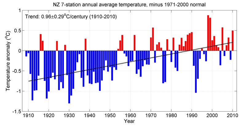 Mean annual temperature for New Zealand, calculated from NIWA's 'seven-station' series. This series uses climate data from seven geographically representative locations. The data are adjusted to take account of factors such as different measurement sites. The blue and red bars show the difference from the 1971-2000 average. The black dotted line is the linear trend over 1910 to 2010 (0.96°C/100 years).
