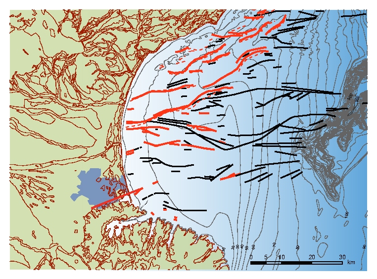 NIWA’s seismic survey found a number of previously unknown faults beneath the Pegasus Bay seabed, and a few old ones that had been jolted back to life. Red - active faults; black - inactive faults.