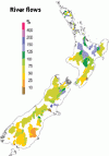 Percentage of average February river and stream flows at monitored catchments. NIWA field teams, regional and district councils, and hydropower companies are thanked for providing data.