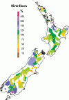 Percentage of average January river and stream flows at monitored catchments. NIWA field teams, regional and district councils, and hydropower companies are thanked for providing data.