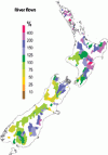 Percentage of average May river and stream flows at monitored catchments. NIWA field teams, regional and district councils, and hydropower companies are thanked for providing data.