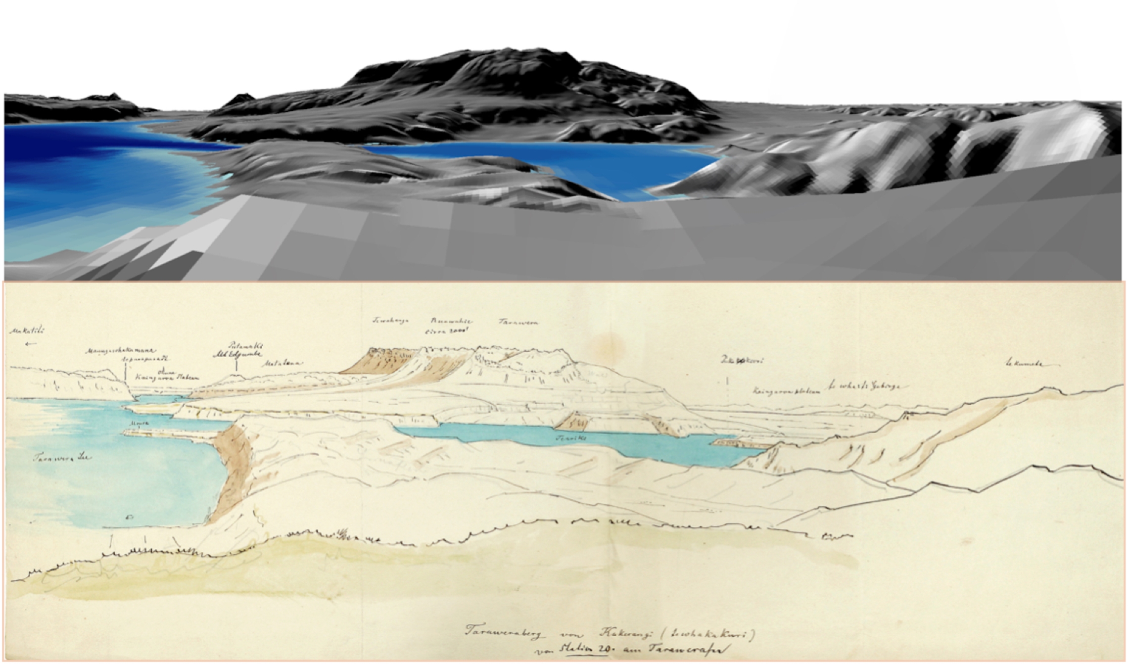 Digital elevation oblique view of Mount Tarawera and the surrounding landscape near Lake Tarawera based on von Hochstetter’s (1859) survey notes. Bottom: Watercolor and pencil sketch of the same view crafted by Ferdinand von Hochstetter April 1859 (modified from Nolden and Nolden, 2013).