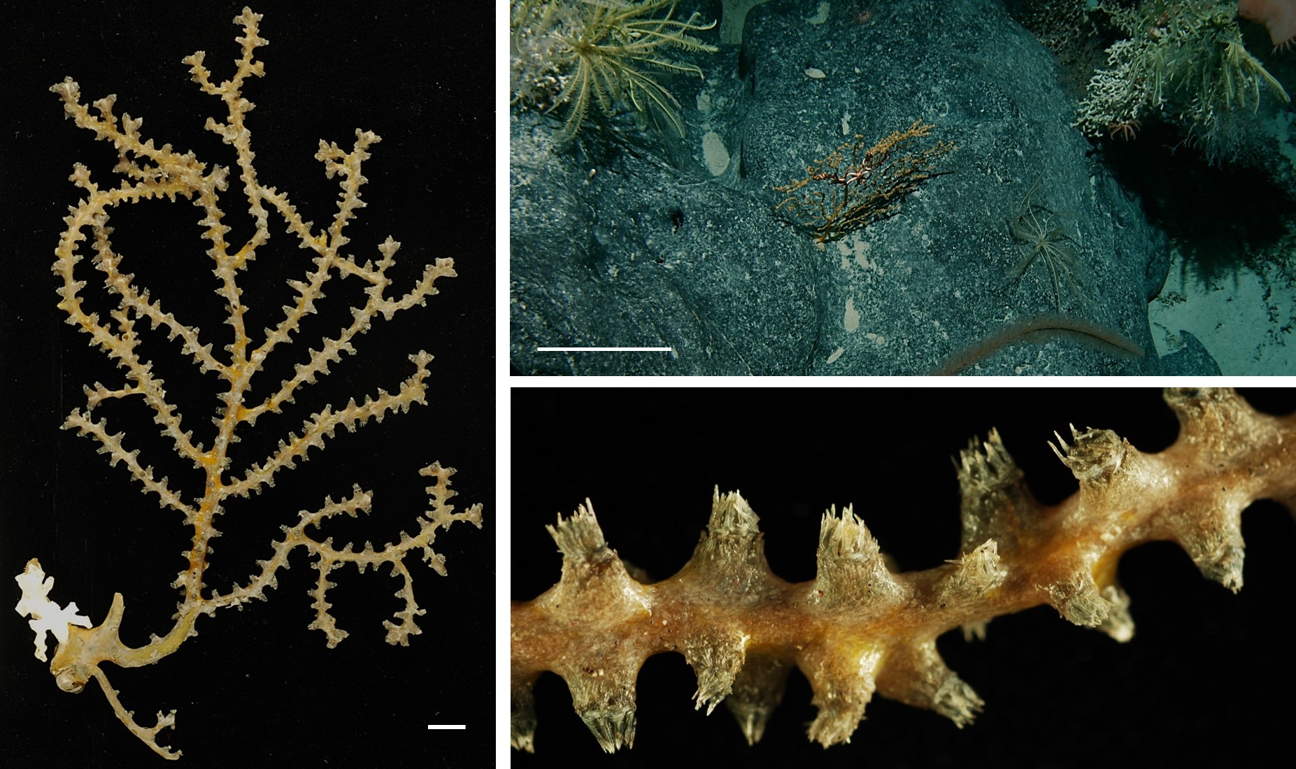 Various views of Placogorgia. Scales: left image = 1 cm, sea floor image = 20 cm. Credit: Owen Anderson and DTIS NIWA/ Vulnerable Deepsea Communities voyage TAN1402.