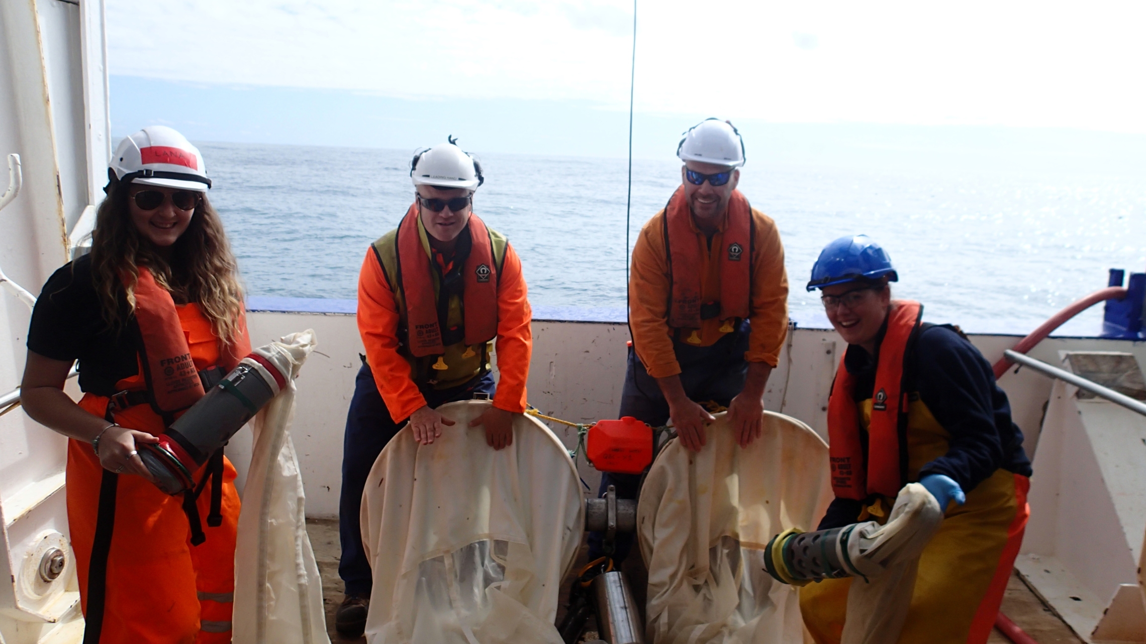 Sir Peter Blake Ambassador Lana Young, crew members Shane Harvey and Phil Bignell, and NIWA’s Sadie Mills ‘play’ the Bongos.