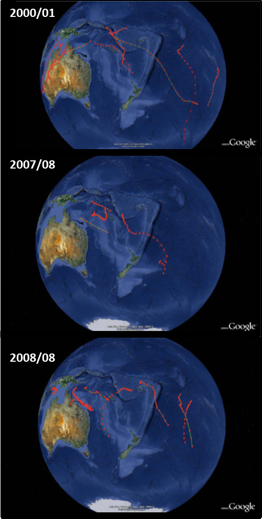 Figure 2: Plots of tropical cyclone tracks and other storms that were monitored for analogue years used in the 2011-12 late season forecast (February – April).