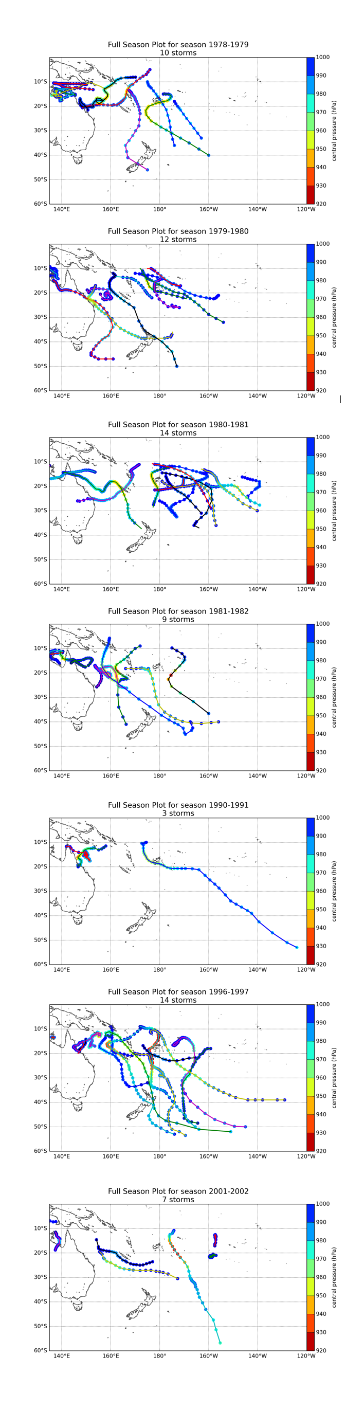 Figure 2: Plots of tropical cyclone tracks and major storms that were monitored for analog seasons used in the 2013-14 seasonal forecast for the full season (November - April). Track data are courtesy of the Australia Bureau of Meteorology.