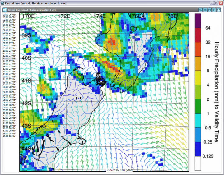 The forecast map of hourly rainfall for 1pm, Sunday 27 March, from the forecast generated at 6pm the previous evening. It shows a band of strong convection of very high rain-rate (in the order of 32 - 64 mm in an hour) in red, just north of Porirua. The amount of rain and time were right, the location was slightly out. NIWA has about 100 climate weather stations positioned around NZ. The Mana station is indicated in the map.