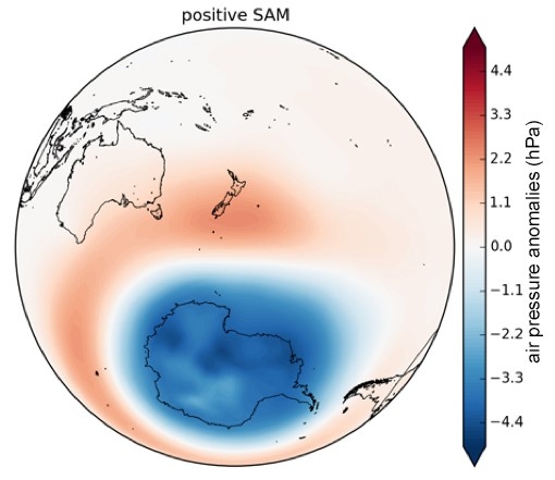 A schematic of the positive phase of the SAM. Areas of above normal pressure are shaded in red while areas of below normal pressure are shaded in blue.