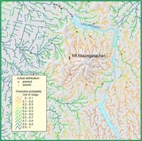 Predicted distributions of shortfin eels Anguilla australis in rivers and streams around Maungatautari in the Waikato region.