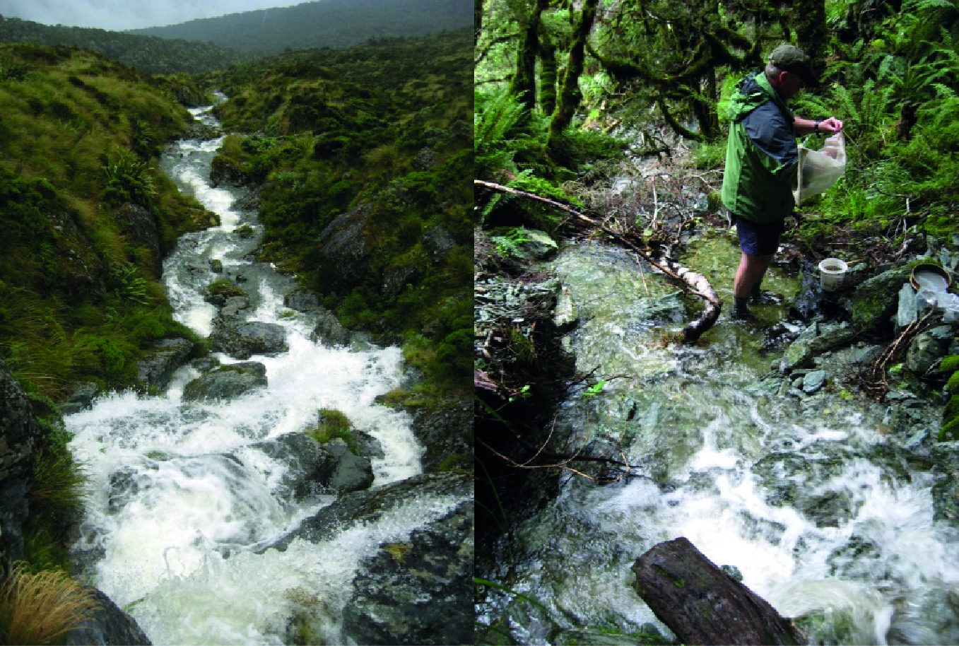 Alpine stream at the top of the Routeburn Track, Fiordland. Vegetation surrounding streams provides an important food source for stream invertebrates. Tussock provides some food, but beech forest provides much more.