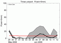 Probability of rainfall exceeding 5 mm, 29 May to 12 June 2006. The red line indicates that rainfall higher than 5 mm occurs, on average, less than once in 10 days. More than 5 mm of rain is more likely than this on 7-8 June.