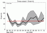 Probability of rainfall exceeding zero, 29 May to 12 June 2006. The background (climatological) chance of rain occurring on any day during the period is about 26% (red line). There is less chance than usual of rain in the first three days of June, and a h