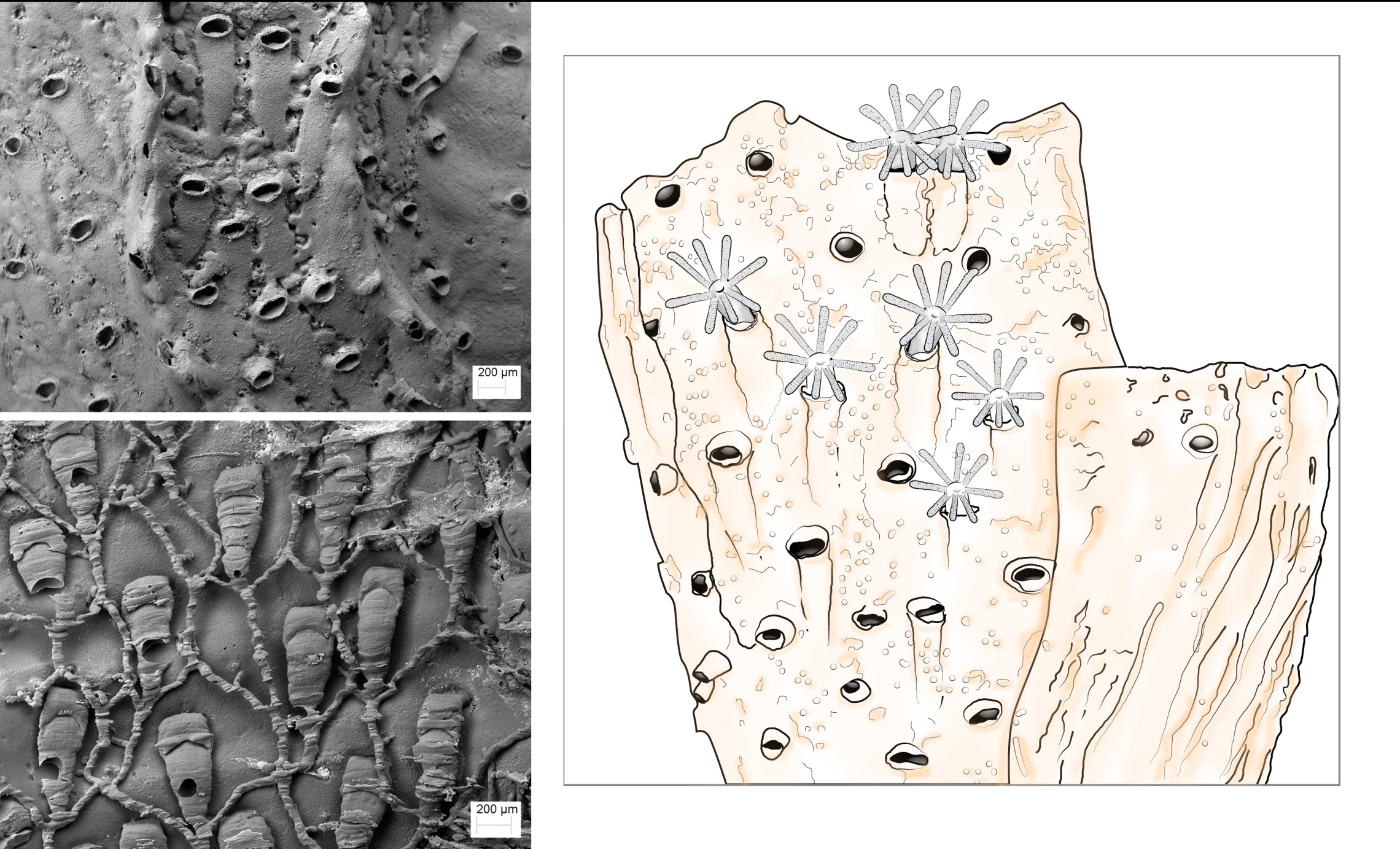 SEM image of Protulophila openings in serpulid fan worm tube (Paul Taylor, NHM London). Bottom left: Resin cast of Protulophila burrows and connections in worm tubes (Paul Taylor, NHM London). Right: Artists impression of living Protulophila (Erika Mackay, NIWA).