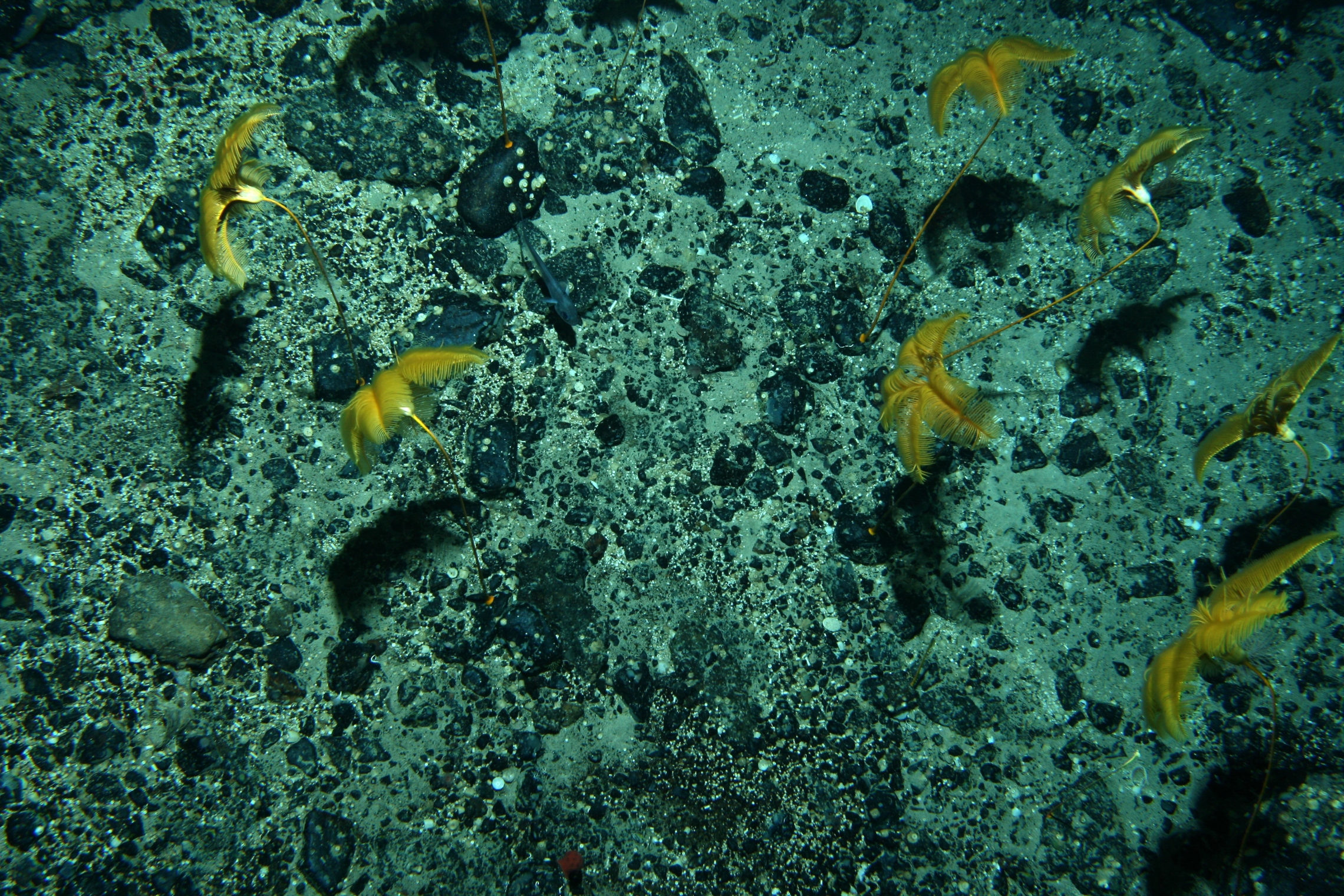 Meadows of the new species of Ptilocrinus amezianeae observed along a southeastern knoll of the Admiralty seamount, around 600 m.