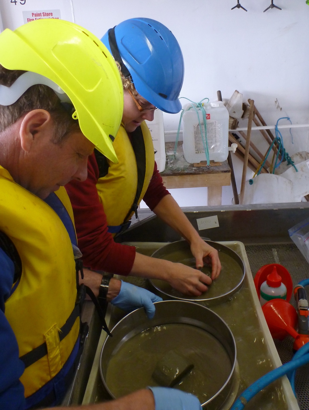 ‘Puddle sieving’ is gentle on the small organisms which hide in the mud. NIWA scientists Rob and Kareen separate the goodies from the mud. Credit: Owen Anderson/NIWA