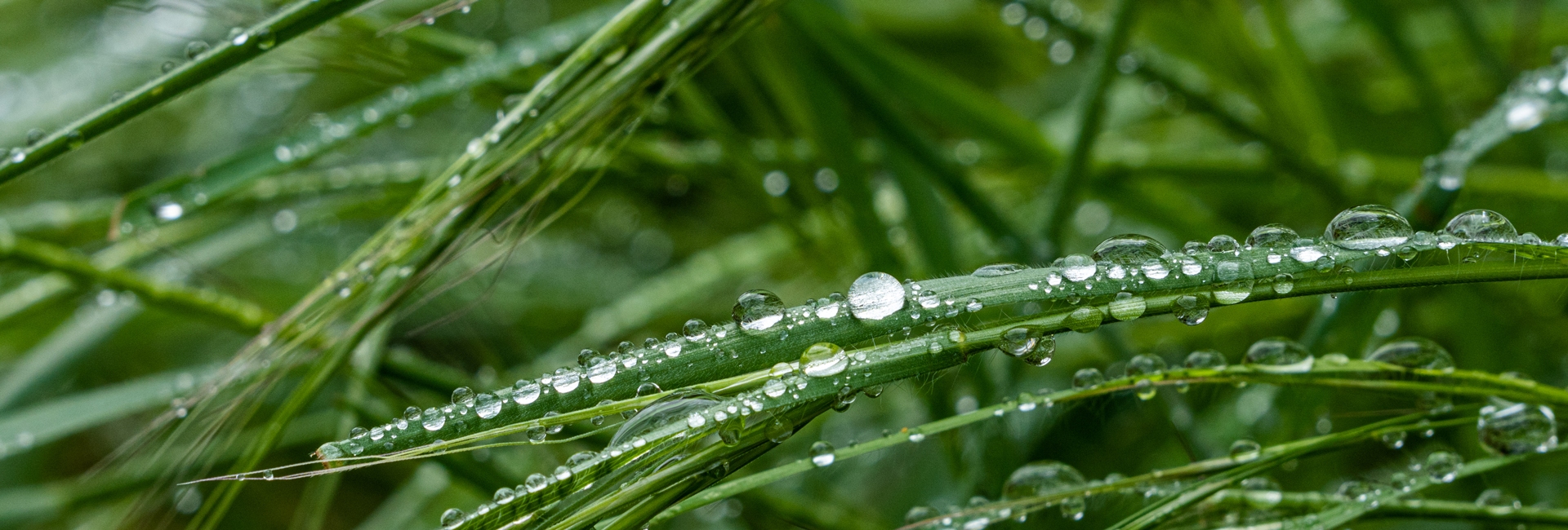 Close-up of raindrops on grass.