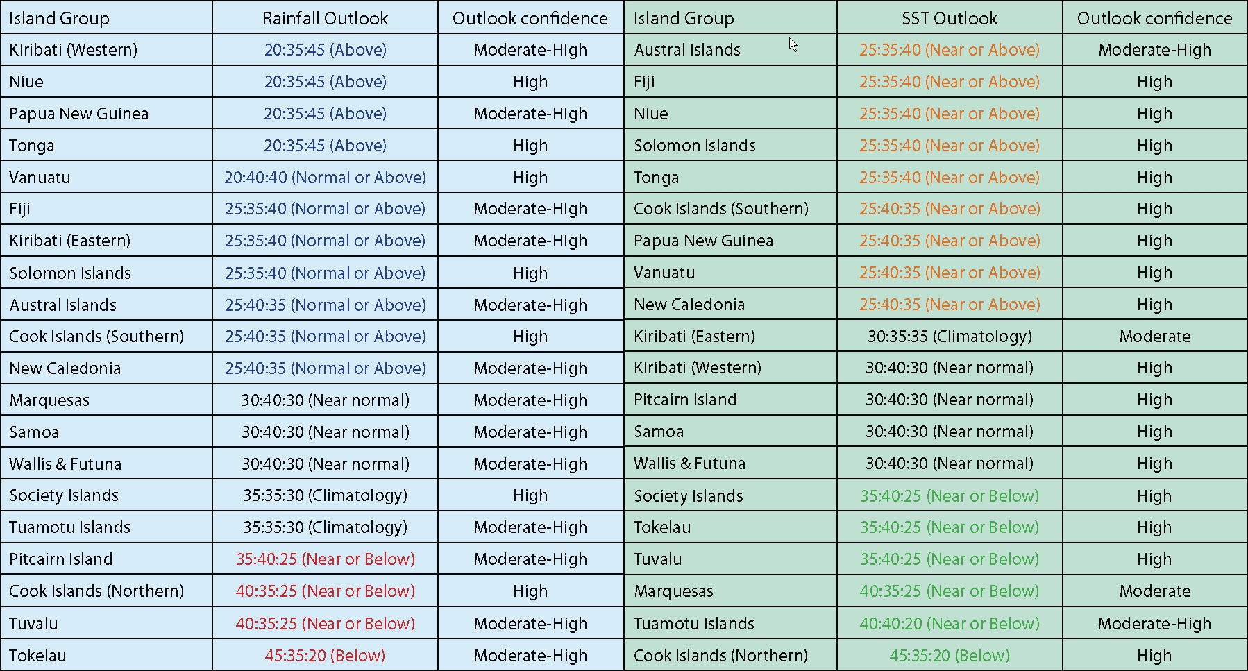 NOTE: Rainfall and sea surface temperature estimates for Pacific Islands for the next three months are given in the tables below. The tercile probabilities (e.g., 20:30:50) are derived from the averages of several global climate models. They correspond to the odds of the observed rainfall or sea surface temperatures being in the lowest one third of the distribution, the middle one third, or the highest one third of the distribution. For the long term average, it is equally likely (33% chance) that conditions in any of the three terciles will occur. *If conditions are climatology, we expect an equal chance of the rainfall being in any tercile.
