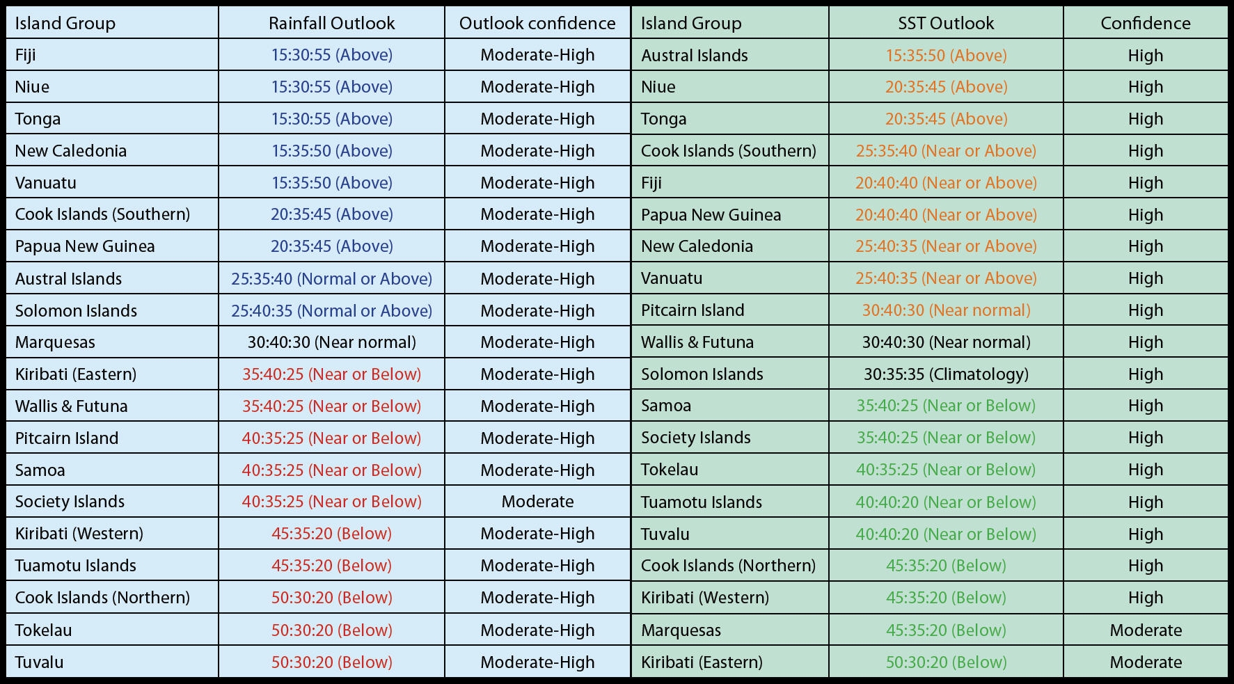 NOTE: Rainfall and sea surface termperature estimates for Pacific Islands for the next three months are given in the tables below. The tercile probabilities (e.g., 20:30:50) are derived from the averages of several global climate models. They correspond to the odds of the observed rainfall or sea surface temperatures being in the lowest one third of the distribution, the middle one third, or the highest one third of the distribution. For the long term average, it is equally likely (33% chance) that conditions in any of the three terciles will occur. *If conditions are climatology, we expect an equal chance of the rainfall being in any tercile.
