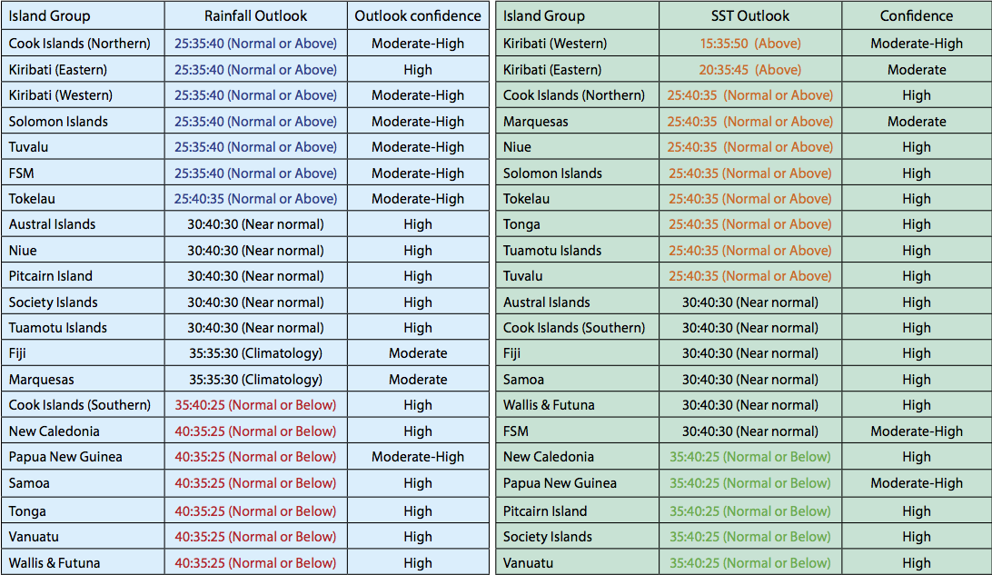 Rainfall and sea surface temperature estimates for Pacific Islands for the next three months are given in the tables above. The tercile probabilities (e.g., 20:30:50) are derived from the averages of several global climate models. They correspond to the odds of the observed rainfall or sea surface temperatures being in the lowest one third of the distribution, the middle one third, or the highest one third of the distribution. For the long term average, it is equally likely (33% chance) that conditions in any of the three terciles will occur.