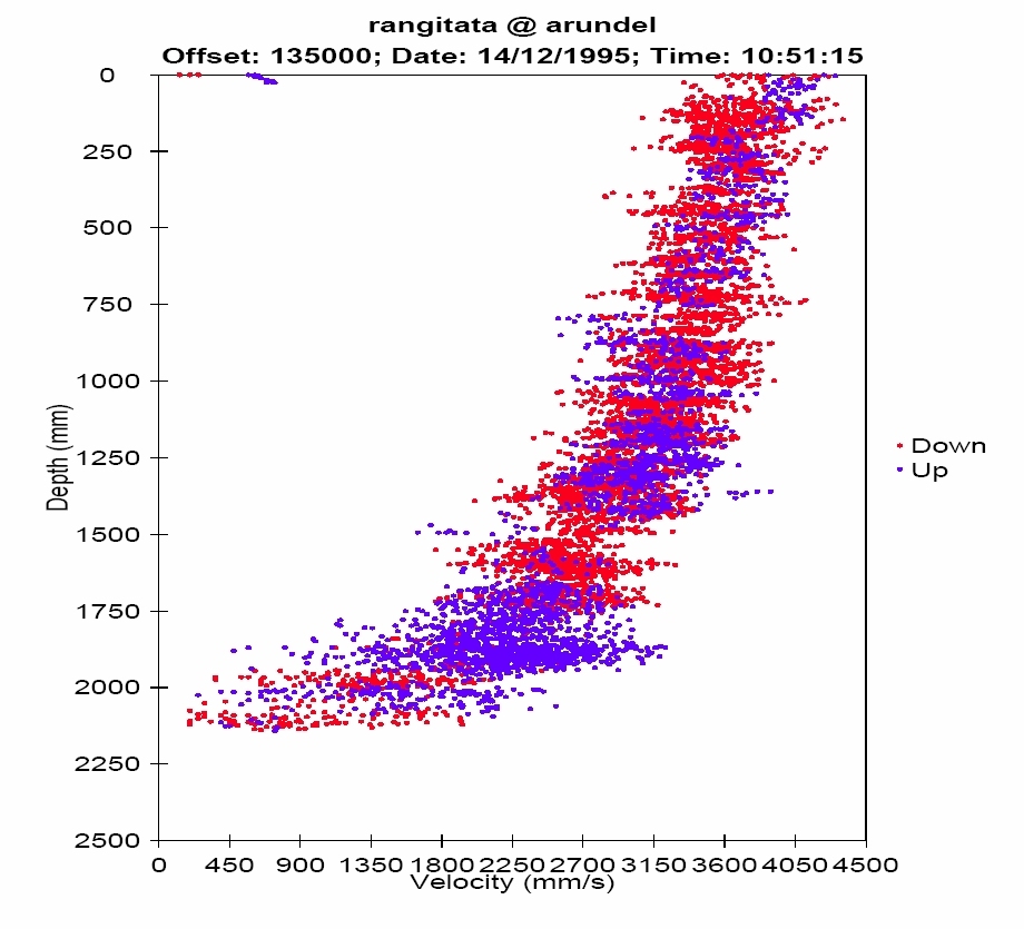 Water velocity as measured by the POEM as it travels down (red data), and then back up (blue data) through the water.