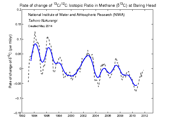 Rate of change of 13C in CH4 at Baring Head - May 2014