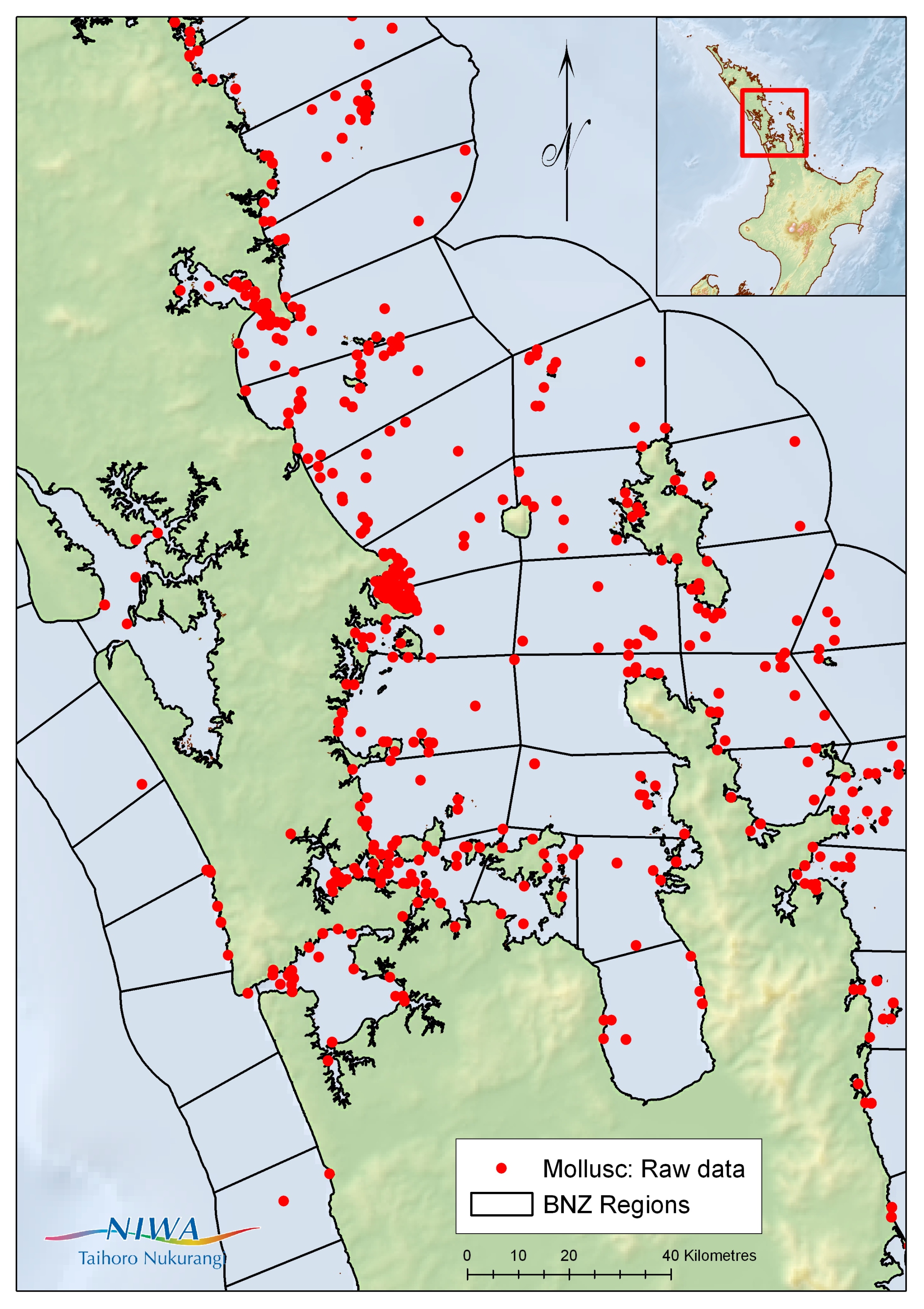 An example of the spread of raw data (Mollusc data) around the New Zealand coastline.