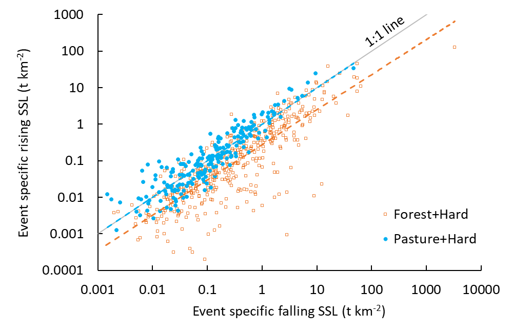 Figure 4 An example relationship between specific suspended sediment load (sediment load divided by upstream catchment area) through rising and falling stages of the hydrograph for catchments with different land cover