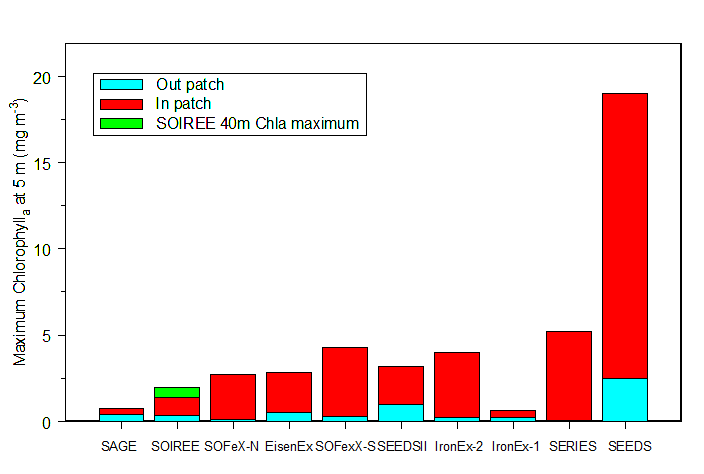 Plot comparing the response of the phytoplankton (as maximum chlorophyll-a) with the response in other iron experiments. Red bars indicate the chlorophyll-a inside the iron-enriched patch and the blue bars the chlorophyll-a in waters outside the patch (Harvey et al, 2011).