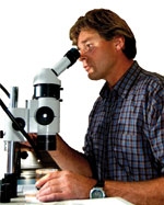 Reyn Naylor checks the progress of the tiny paua in one of the experimental jars. (Photo: Alan Blacklock)