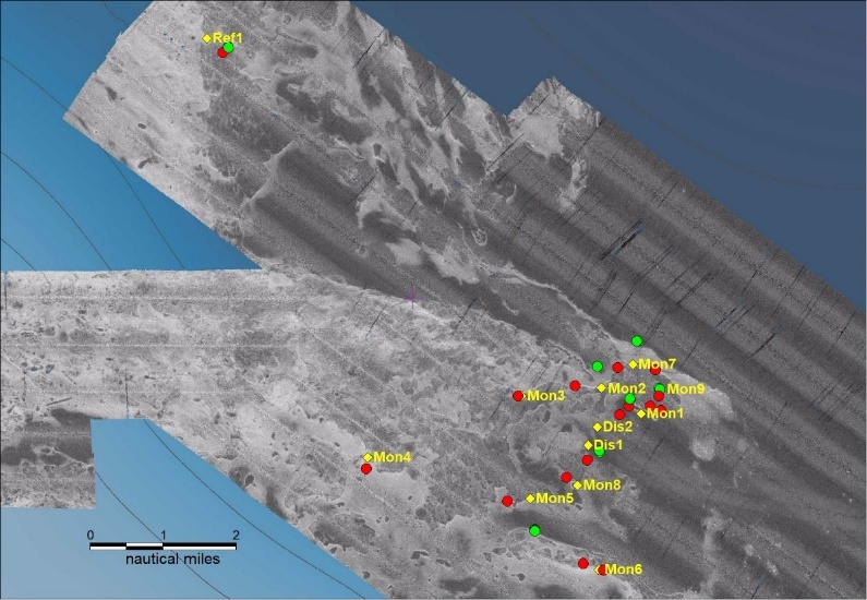 The sampling sites (MON, DIS, REF) for camera (red) and multicorer (green) from 2018, repeated in 2019
