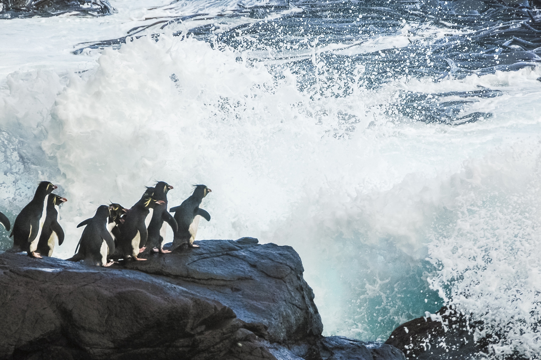 Eastern Rockhopper Penguins assess the risks of crashing waves and hunting New Zealand sea lions before departing on a chick-provisioning trip on Campbell Island. [Kyle Morrison].