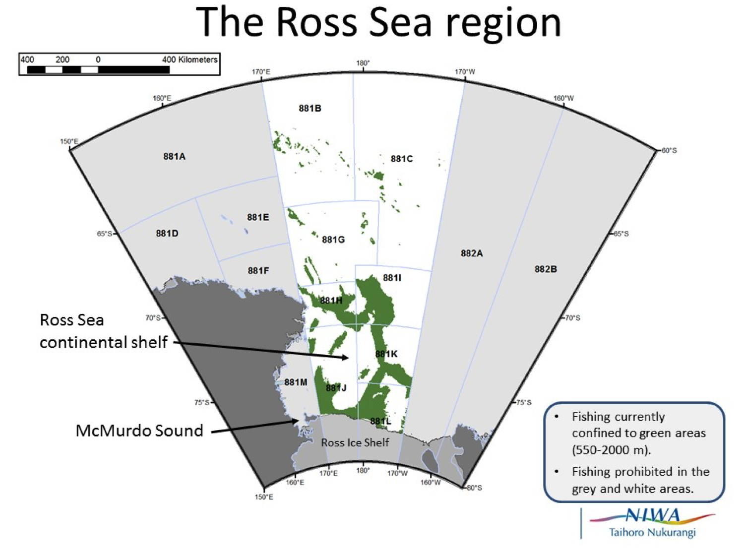 The Ross Sea region is divided into different areas, called Small Scale Research Units (SSRUs), for the purposes of managing fishing. Only the green areas are currently fished. The rest are either closed by CCAMLR (grey areas), or not fishable due to depth (< 550 or > 2,000 m, white areas).