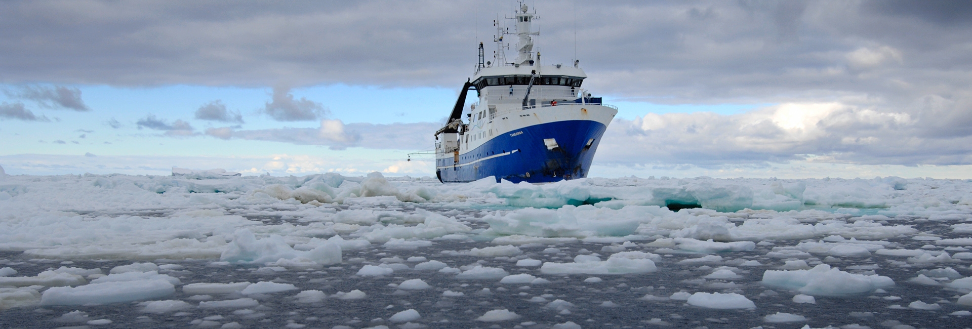 RV Tangaroa steams through the sea ice in Antarctica