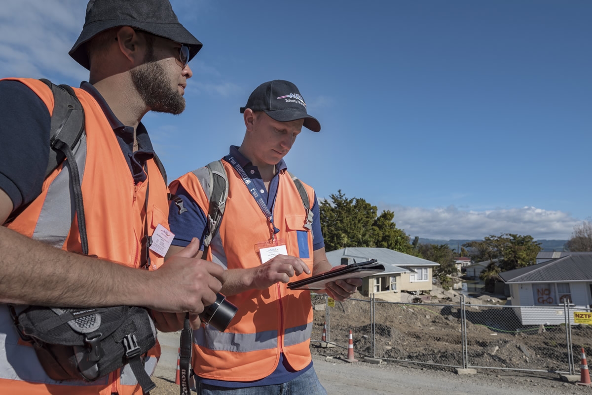 NIWA Hazard Analysts Shaun Williams (left) and Ryan Paulik survey residential properties after the Edgecumbe flooding event in April 2017.