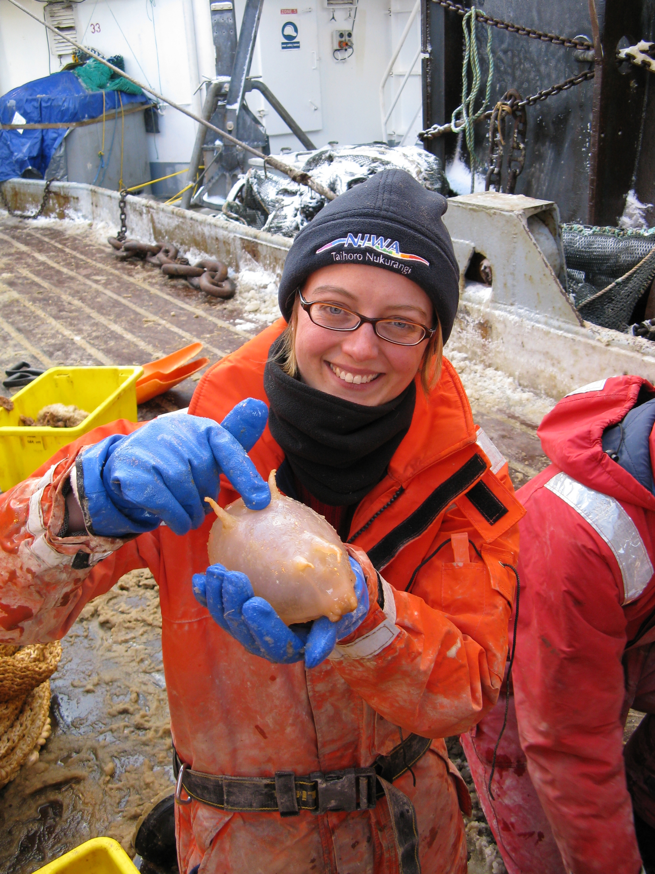 This is the now (in)famous photo of our own Sadie on the trawl deck of R/V Tangaroa during the 2008 IPY-CAML voyage to the Ross Sea, Antarctica. She is pointing out how big a seapig can get. [Richard O'Driscoll / IPY-CAML].