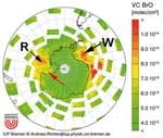 This satellite image shows elevated BrO levels (red and orange) in the regions of the Ross Sea (R) and Weddell Sea (W)