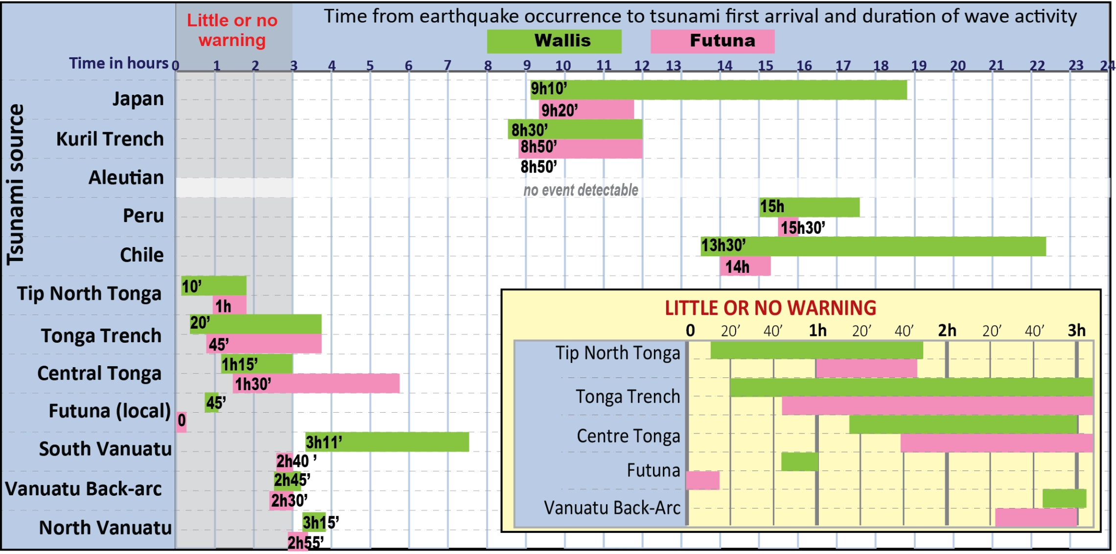 Fig. 5: Schematic view of arrival times and duration of tsunami activity.