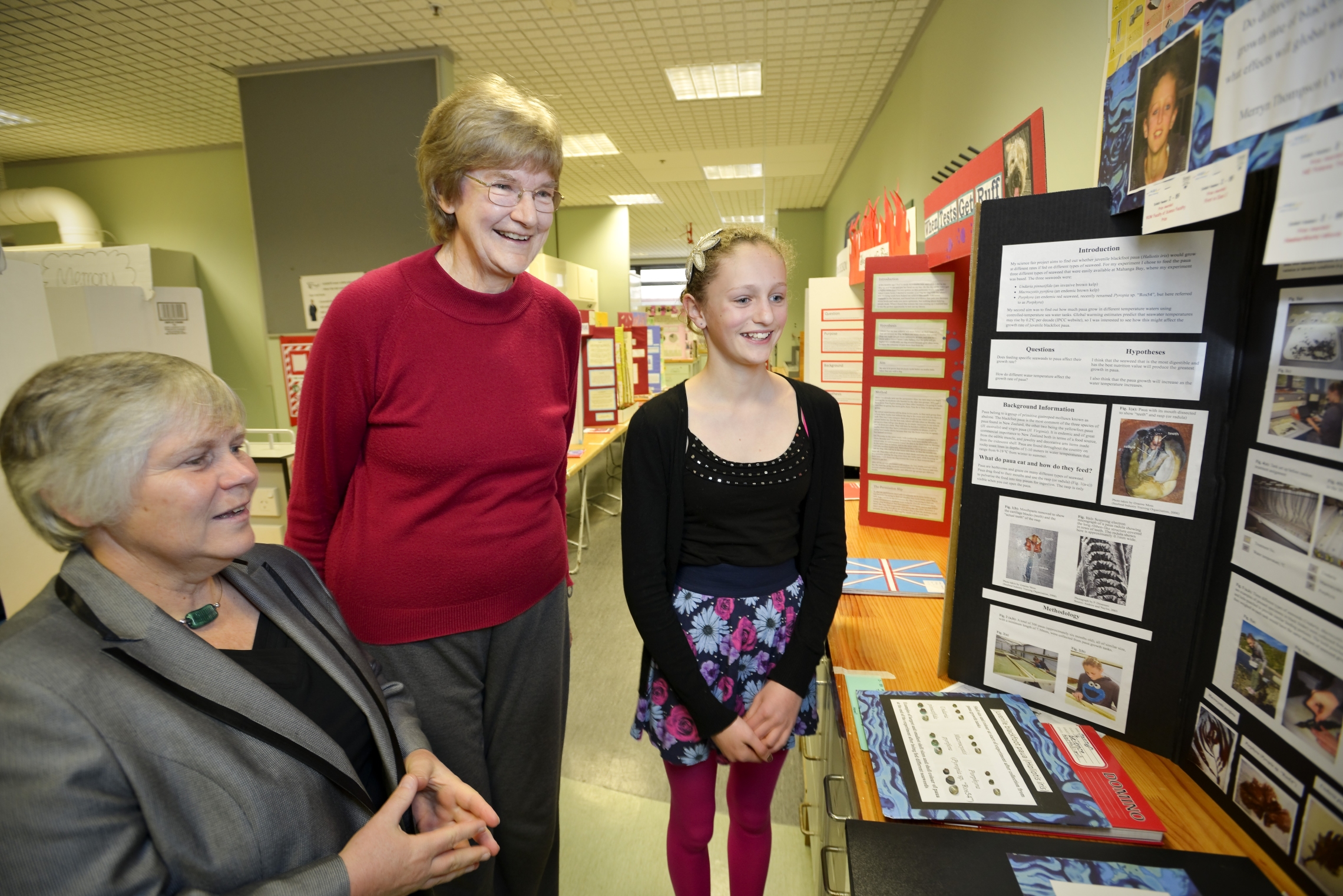 NIWA Regional Manager Dr Julie Hall, Victoria Universities Pro Vice Chancellor Dr Margaret Gordon and Wellington science fair entrant Merryn Thompson