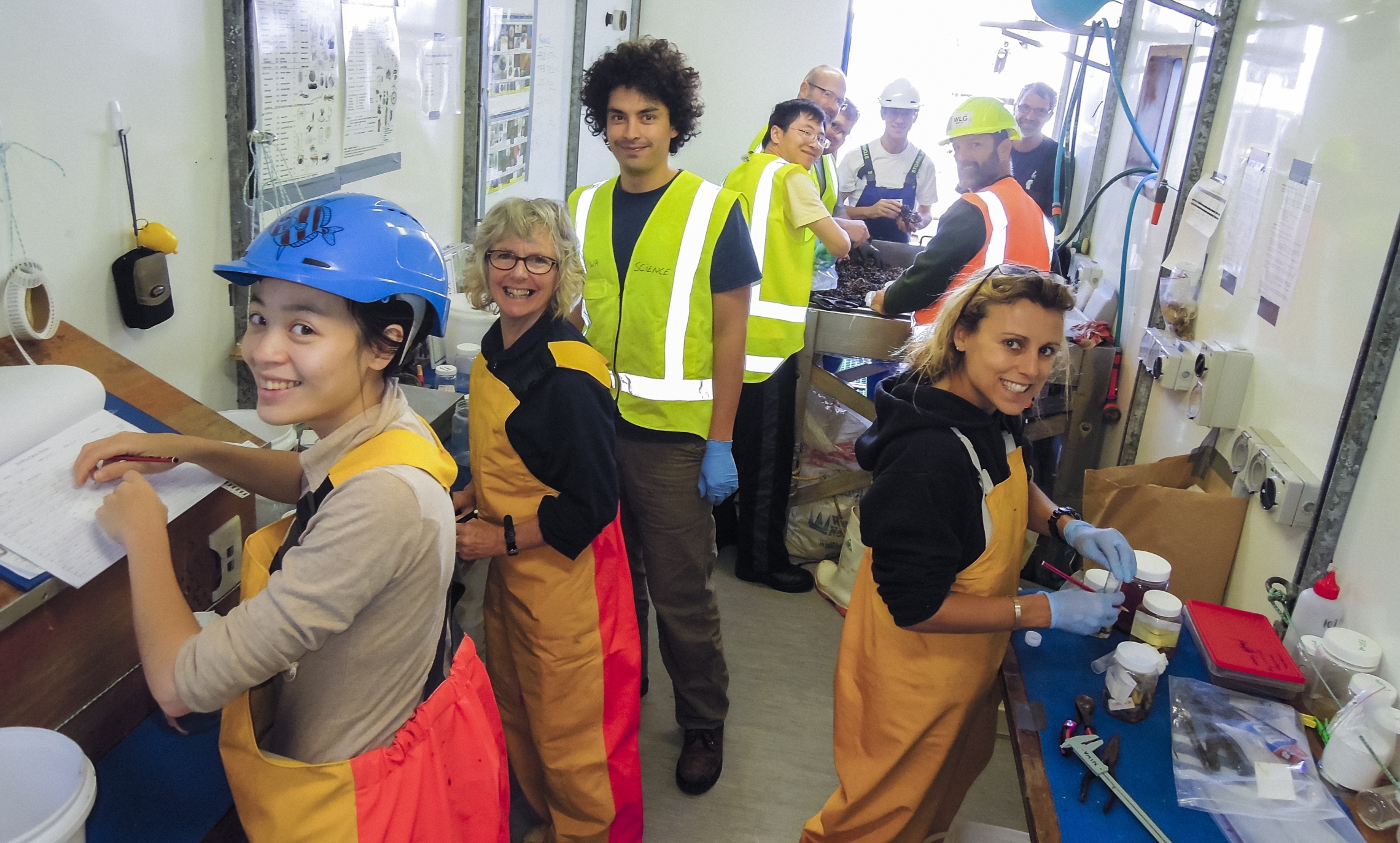 Science staff on board RV Tangaroa sorting through speciments from the epibenthic sled.  Photo taken during 2014 survey of the Louisville Ridge.